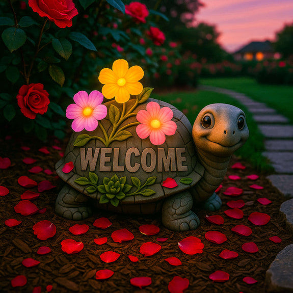 The Whimsical Welcome Turtle lights up any entrance with its vibrant, illuminated flowers and charming smile. Its playful yet elegant design invites joy, wonder, and comfort to your home.